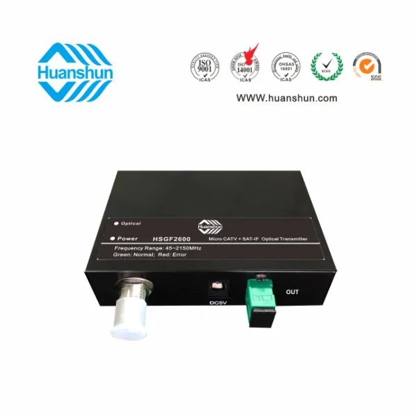 CATV&SAT-IF光發送機 | HSGF2600-1302 | RF工作帶寬45~2150MHz,光輸出功率有2或3mW可選,型號后綴13代表1310nm波長,15則代表1550nm波長,最后2位數字02表示2mW,03則表示3mW,RF接口F型公制或英制(訂貨時說明),光輸出接口SC/APC |