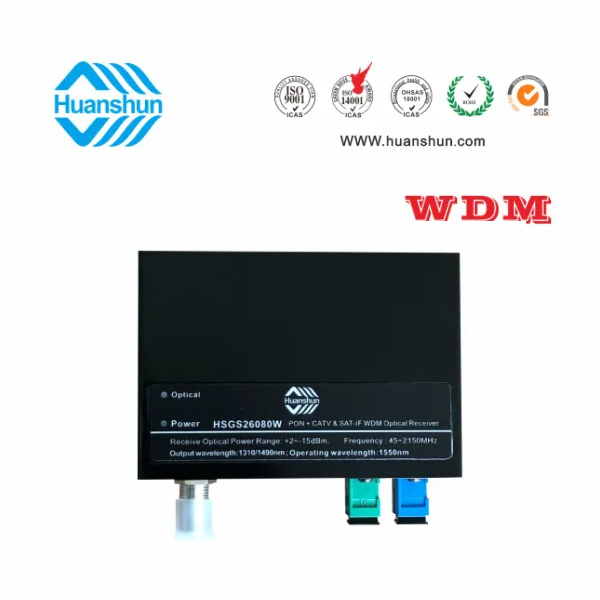 WDM型CATV&SAT-IF光接收機 | HSGS26080W | 光接入1310/1490/1550nm,PON端口1310/1490nm,CATV光工作波長1540~1565nm,光接收功率-8~0dBm/RF CATV80dBuv,RF工作帶寬45~2150MHz,SAT-IF65-75dBuv,RF接口F型公制或英制(訂貨時說明),光輸入接口SC/APC |